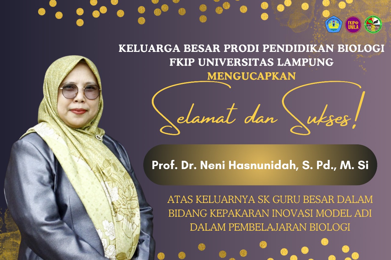 Bandar Lampung – Prestasi membanggakan kembali diraih oleh dosen Pendidikan Biologi Universitas Lampung, Dr. Neni Hasnunidah, S.Pd., M.Si. yang kini resmi menyandang jabatan Guru Besar di bidang kepakaran inovasi Argument-Driven Inquiry (ADI) dalam pembelajaran biologi. Setelah sukses menjabat sebagai Lektor Kepala, kini beliau naik ke jenjang berikutnya, yaitu dengan jabatan Guru Besar Bidang Kepakaran.