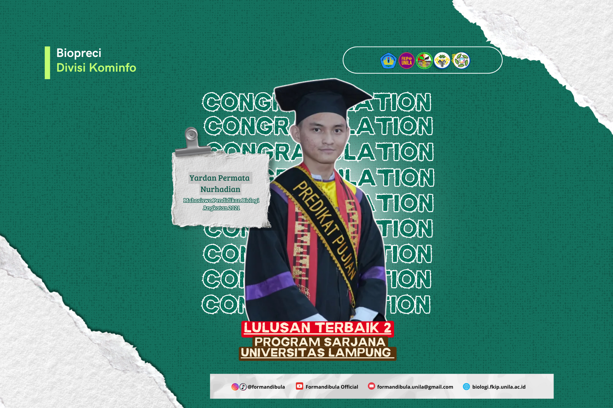 Bandar Lampung, 17 Mei 2025 – Kami segenap keluarga besar Pendidikan Biologi dengan bangga mengucapkan selamat kepada Yardan Permata Nurhadian, S.Pd atas prestasi gemilangnya sebagai lulusan terbaik kedua pada wisuda program sarjana Fakultas Keguruan dan Ilmu Pendidikan, Program Studi Pendidikan Biologi, Universitas Lampung. Pencapaian ini adalah hasil dari kerja keras, ketekunan, dan semangat belajar yang tidak pernah padam. Yardan telah menunjukkan bahwa orang yang sangat berdedikasi dan berkomitmen pada pendidikan dapat berhasil. Yardan adalah mahasiswa Pendidikan Biologi yang hebat dalam akademik dan aktif dalam kegiatan organisasi dan pengembangan diri, menjadi inspirasi bagi banyak rekan sejawat.