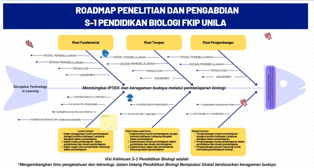 Program Studi Pendidikan Biologi FKIP Universitas Lampung memiliki roadmap dan payung penelitian yang dirancang untuk mendukung pengembangan keilmuan biologi serta peningkatan kualitas pendidikan biologi di Indonesia. Fokus utama penelitian mencakup bidang keilmuan biologi, pendidikan biologi, pemanfaatan media dan teknologi pembelajaran, serta kajian lingkungan berbasiswa wawasan global dan keragaman Budaya. Payung penelitian ini disusun selaras dengan visi institusi, isu-isu strategis nasional dan global, serta kebutuhan masyarakat. Dosen didorong untuk melakukan penelitian kolaboratif lintas bidang yang relevan dengan kebutuhan sekolah, masyarakat, dan perkembangan IPTEK,.